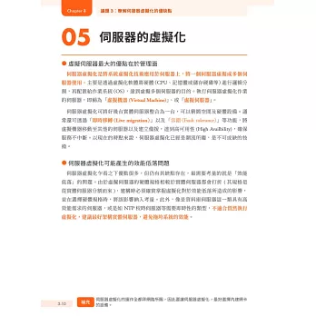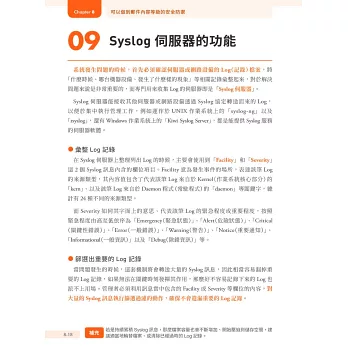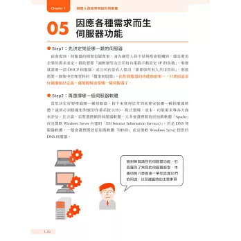 例如,有些伺服器是只在企業內部運作、有些則是對外公開營運,這兩種當中就涵蓋多達數十種的伺服器類型,該如何選擇?此外目前虛擬化、雲端化等 IT 技術持續發展,網管人員該如何與時俱進、在伺服器的建置上因應這些新議題?本書將列舉常見的對內、對外伺服器,讓您完整認識其用途以及建置時必須注意的要點。