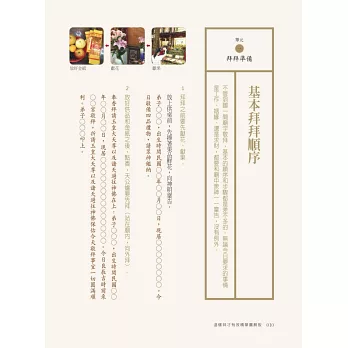 因此,本書把拜拜流程、步驟一一拆解,最重要的是附上重點說明以及拜拜小抄,