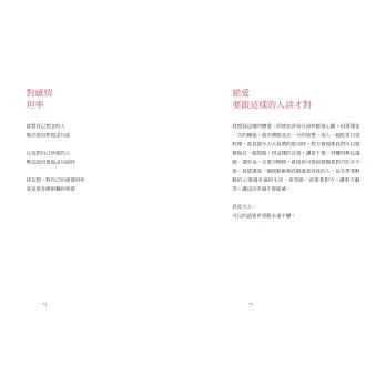 ★我不喜歡那種描述戀愛過程中和另一半吵架的愛情故事。那種讓人渾身不自在的感覺,還有那個當下,都令人非常不喜歡。但讀了這本書之後,雖讓人感到渾身不自在,但卻又感覺有些悸動,原來人生終究還是離不開愛情。