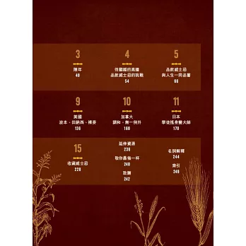 全美最具公信力威士忌雜誌《Whisky Advocate》前任總編輯盧.布萊森(Lew Bryson)親臨蘇格蘭、愛爾蘭、北美洲與日本的威士忌產區採訪蒸餾廠與釀酒師,探究決定威士忌風味的各種因素,以地圖、資訊圖表及風味側寫描繪代表性酒款,帶領讀者發掘不同原料與製酒手法釀出的特色酒款。除了基礎知識及歷史背景,也傳授如何收藏與陳放威士忌,了解威士忌的侍酒方式,更進一步介紹餐搭及相關調酒,幫助威士忌迷融會貫通、推門進階,盡情喜受「生命之水」的風味精華!