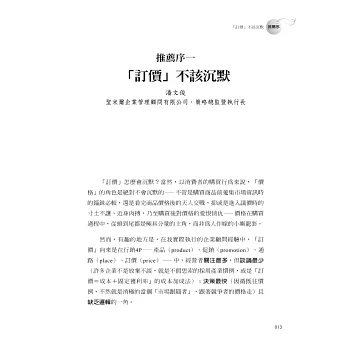 更可貴的是,不論是操作實務上具體的「訂價診斷書」,理論基礎深厚的「行為經濟學」觀點,或是佐以商業小說式的敘述方法,讀來都生動有趣,而附錄的「延伸閱讀書目」,其專業價值及深度,更是值得肯定。