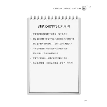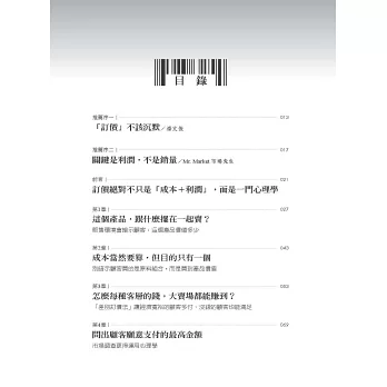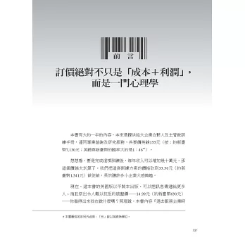這是第一本告訴讀者怎樣循序漸進、把訂價心理學應用在事業上的書;不論你賣的是什麼,產品也好、服務也好,是賣給消費者、別家公司還是政府,都一樣。我會先從如何利用價格定位產品說起,然後解釋如何為不同的市場區隔訂定不同價格;這些方法都有助於順應顧客的想法,而不是違逆他們的心理。