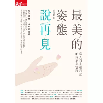 我誠摯地邀請你來閱讀本書,從中你將感受到,《病人自主權利法》的立法理念蘊含了對生命的關懷與尊重;你也將看見,病人自主的理念如何從倫理與法理的思辨過程,以及法律機制的設計,一步一步發展成為你我今日實質擁有的自主權利。我深信,這部法律是保護你我生命的共同語言,而這本書將幫助你學習這個語言,省思生命尊嚴,進而描繪出生命的答案。當更多人能夠將醫療自主與生命善終的關懷傳遞出去,才能創造出集體社會文化改變的契機,促進善終的法律機制更臻完善。