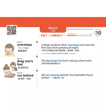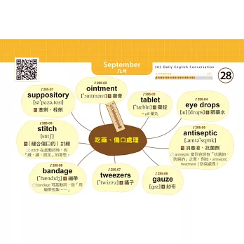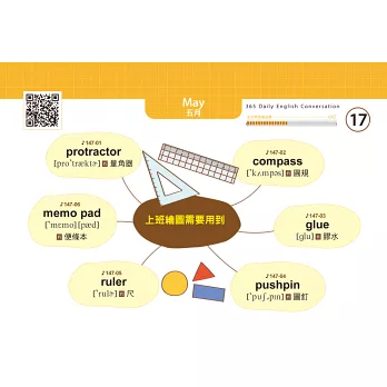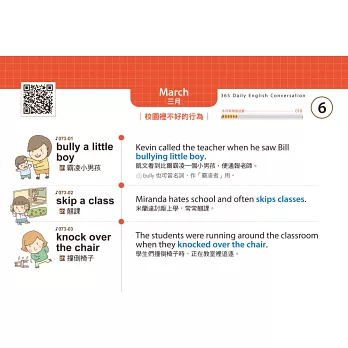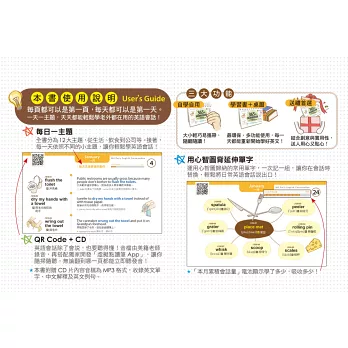 3.本書將會話分類、歸納,每一天都有新的主題,每天學3到4句會話,再隨機補充單字心智圖,一年後英文能力迅速成長!