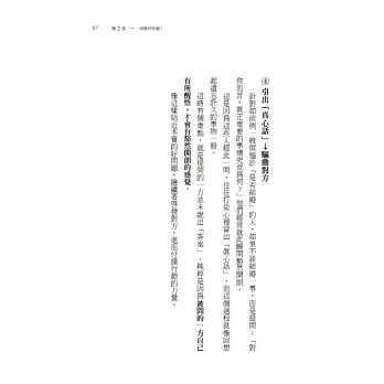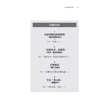 透過這種緊迫盯人方式的提問,不僅能深入核心,也能釐清自己想做的事以及應該前進的方向。作者也不忘提醒大家,提問不同於寫作,無須講求起承轉合,而必須簡短有力,並且對各種人事物抱持深入的洞察,方能貼近問題的本質。