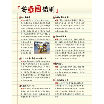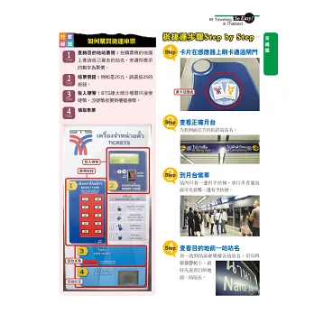 搭機及搭車資訊看板、購票、投幣、按鈕、插孔位置都有拉線指示。詳細介紹市區常見的10種交通工具,捷運、巴士、計程車、雙條車、單車、三輪車、遊船等,帶領旅客瘋遊泰國。