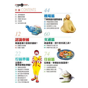 本書依照旅行流程安排篇章順序,從出發前的行李打包、辦理證件、概念閱讀,到抵達機場的入出境手續,及泰國當地的住宿、交通、通訊、飲食、玩樂、購物、緊急情況的應變等資訊,一應俱全,全套泰國旅遊資訊盡在書中。