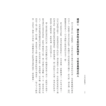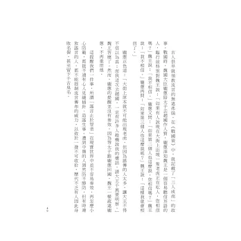 再如,一般人對老鳥或上司的提拔總充滿感恩的心~感謝有你~(高唱),極少懷抱疑心,然而本書從歷史長河的脈絡中,以敏銳目光切入一個值得留心的角度:知遇之恩背後是否隱藏異心或別有目的?該章舉韓信、蔡鍔和魏忠賢為例,解析有時施予小惠,是想以提攜的情分進行牽制之暗黑兵法,防人之心不可無。