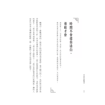 就在我分身乏術,越來越不能按時供稿之時,出版部主編沛晶捎來訊息,希望能將專欄集結出書,當然,這又是另一個挑戰,因為專欄可以隨時因應時事任意抒發己見,但出版成書卻不能不去蕪存菁,呈現宏觀的視野。還好,我遇到一個極為優秀的主編,能與我相互腦力激盪,於是原本的專欄再提升一個等級,成為一本單篇可以各自獨立,通章能相互聯結的完整著作。