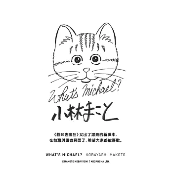 本書是漫畫家小林誠以家裡的美國短毛貓為原型創作的貓咪漫畫,書中不只將貓咪的各種習性畫得活靈活現,呈現漫畫家敏銳的觀察力,還有以貓咪的角度來觀察(愚蠢)愛貓人類的心情,各種擬人化小劇場,甚至是天馬行空的幻想貓咪星球故事。搶眼的配角陣容(傻狗伸之助、胖三花喵吉拉、美貓波波),經典的麥可跳舞場景,趣味橫生的爆笑情節,強力推薦給愛貓人士!
