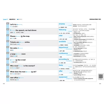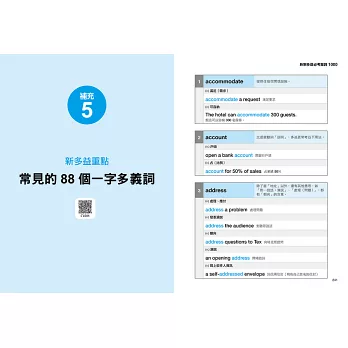 新制多益出現大量「換句話說」、「理解文章脈絡」與「一字多義」題型,本書整理大量近似詞,並提醒常見的短句替代說法,加強單字連結力。書後補充的「多益必考連接詞」與「一字多義」,讓你快速掌握新多益題型。