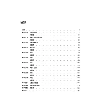 講義的每一章末尾都有許多練習題,這些練習題是本講義的最大特色。許多題目都需要經過一番思考才有辦法動手撰寫,無法即看即寫,目的是希望讀者在學程式過程,學會如何以「數學思維」來解決問題。對毫無頭緒的問題,試著先透過紙筆推導,逐步找出關聯,建構解題步驟,之後才用鍵盤將抽象步驟轉為實體程式碼,如此可避免毫無方向的撰寫程式,胡亂修改測試,以致於幾個小時過後仍是一事無成,時日一久,自然多以「陣亡」收場。但事實上,只要在撰寫程式過程養成紙筆推導習慣,你將發現過去所學的國高中數學對程式設計的重要性。紙筆推導是完成程式設計的一個重要階段,少了紙筆推導,其省下的時間遠不足以補償在程式撰寫階段來來回回修改所浪費的時間。