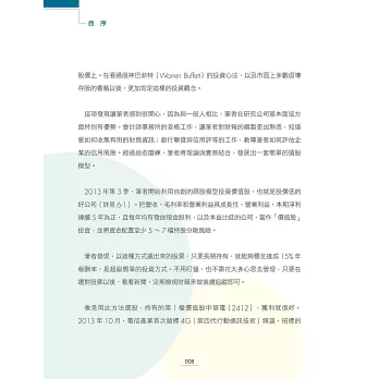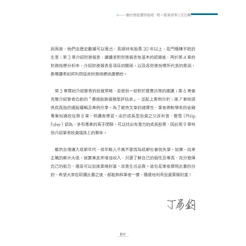 本書作者是在股票投資經驗逾10年,具備會計師、證券分析師、期貨分析師等證照的資深會計師丁彥鈞。他的投資想法與股神巴菲特雷同,認為只要公司的基本面好,股價到後來多半還是會反映的,因此特別重視公司的基本面分析。為此,他自創一張「丁彥鈞價值股篩選模型評價表」,教讀者如何輕鬆選出可以長抱的低價好股。