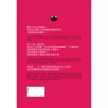 ★「正義」和「邪惡」、「公理」與「私慾」的界線,真的如此清晰分明嗎?藉由駭人事件與社會恐慌的描寫,赤裸裸地揭露現世價值觀的混沌與迷惘。