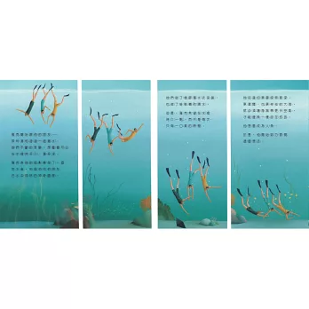 文字優美,刻劃生動,讓讀者如同身臨海底奇境般,藍色和綠色的交織映襯著隨波搖曳的海草,讓讀者有了與雅克.庫斯托同遊海底的奇妙體驗。」──學校圖書館學報
