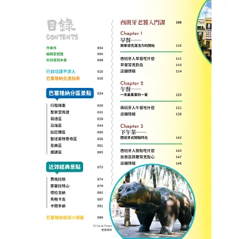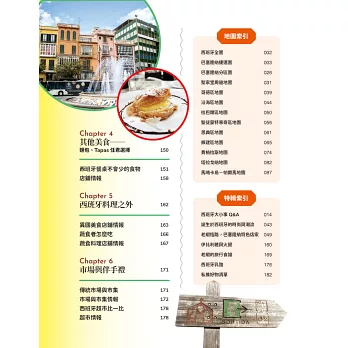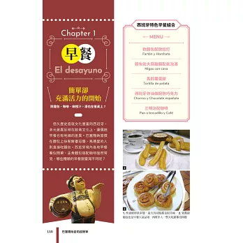 入境就要隨俗,詳細介紹早餐、每日特餐、下午茶,分享重要的選酒知識,讓你知道西班牙人一天都在吃什麼,道地好菜與節慶點心有哪些!另外,還貼心準備了「食用西文」,跟著書上文字指指點點,不懂西文也能大方點餐、盡享美食。