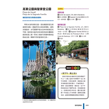 倘若旅行時間有限,「1日精華路線」、「3日經典路線」、「郊區2日遊」就直接套用;若不趕時間,那就從高第的聖家堂出發,由現代化的「擴建區」穿梭回到中古世紀「舊城區」,還可搭乘纜車上山一覽市區全景,看建築師們如何把這裡打造成一座多采又與眾不同的城市。