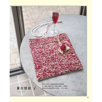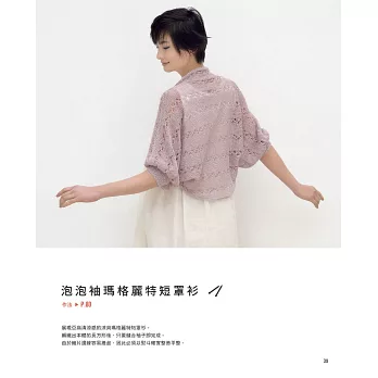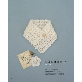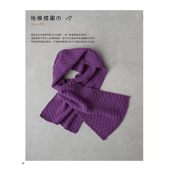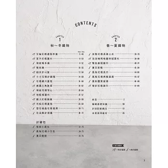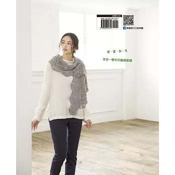 作品以季節分類,春夏的纖麗鏤空罩衫、遮陽草帽、穿搭點綴的輕巧領巾等,清爽配色令人忍不住想要動手!秋冬季更是享受針織品輕柔觸感的大好時節,帽子、手套、圍巾、披肩、膝上毯……目不暇給的繽紛令人選擇困難!翻閱本書,安排一整年的編織計劃,享受織線逐漸編織成型的手作成就感吧!