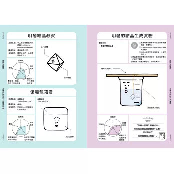 ● 實驗器材擬人化, 依實驗類型分成5個章節,共介紹超過 20 種化學實驗。