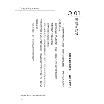 思考實驗對培養思維能力有很大幫助,它是古今中外哲學家們的思考工具。而且透過有趣的對答形式,在遊戲中激發創意思維。從此發現思考是如此愉快,讓你的頭腦更加清晰!