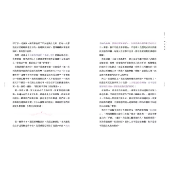 在最低潮的時候,多麼需要一聲鼓勵給自己勇氣、多麼需要一雙手拉自己一把,我懂。所以我很希望這本書將會是你所需要的一聲鼓勵、一雙手,告訴你,你並不寂寞,你並沒有自己想像的那麼弱。 每走過一次難關,再次看到陽光時,我都很慶幸自己當時挺過了,我走過來了!如果你也是過來人,你一定懂,還好,我們都沒有放棄自己。不是嗎?