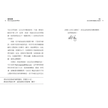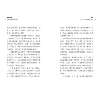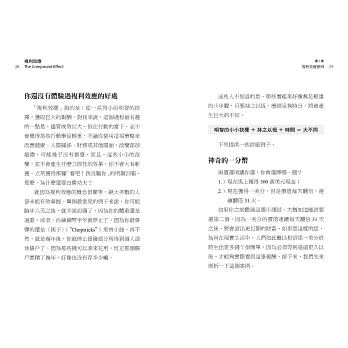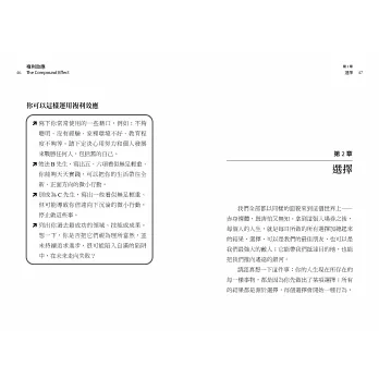 作者以第一人稱說故事的方法,以6步驟、8大自我量表和讀者分享「複利效應」的概念,全書精簡、好讀。
