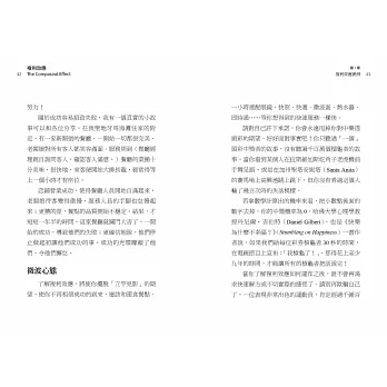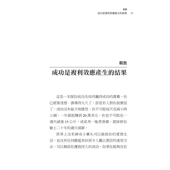成功不是靠運氣,不論你做什麼、學什麼,使用什麼戰術或策略,有什麼目標與渴求,成功都是複利效應產生的結果。「複利效應」源於一項簡單原理:每天看似不經意的小決策,將引領你邁向你一直渴望的人生,或是導致你走向不幸與失敗。不是大事累計起來發揮最大功效,而是成百上千、成千上萬,甚至數百萬件小事累計起來,區分出平凡與卓越。