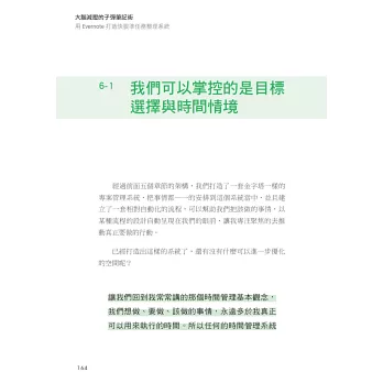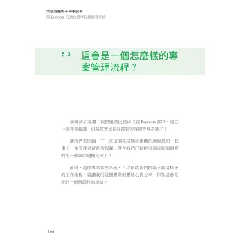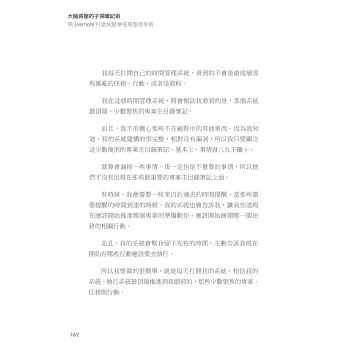 - 本書不是心得集結,不是技巧大雜燴,而是從頭到腳,帶你一步一步建構一套可以管理所有事情的管理系統。