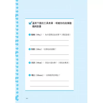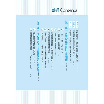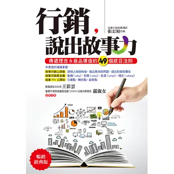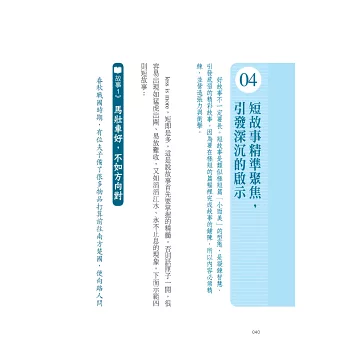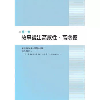 書中含括多種故事型態,包含親身經歷、他山之石、神話、典故、寓言與歷史故事等,甚至還精心設計了深具喻意的故事圖卡,幫助活化右腦思維,激發鼓舞人心的正向思考。不論是什麼身分、扮演什麼角色,我們都能乘著故事的翅膀,飛向美好的彼岸,成為一名有力的說服者、溝通者。