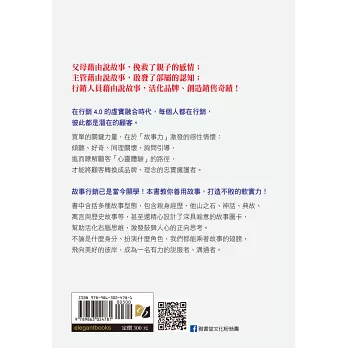 行銷人員藉由說故事活化品牌,創造銷售奇蹟!然而,故事的力量遠遠不止於此。除了在行銷方面無往不利,「說故事」也能為生活帶來更多的幸福感,為團隊帶來向心力及認同感,於是,父母藉由說故事能夠挽救了親子的感情,主管藉由說故事則能啟發了部屬的認知、凝聚團隊士氣。