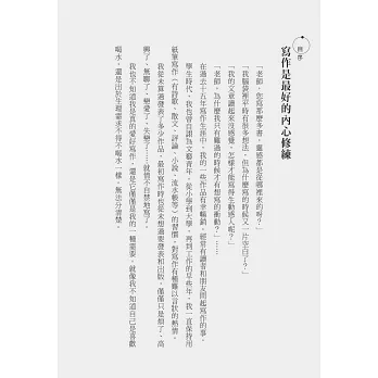 她認為,寫作可以很神聖,也可以很日常。即便從未提筆寫作,或者根本不知道該怎麼寫,都不要緊。只要願意為自己努力,人人都可以成為寫作者;每個人都可以透過寫作,書寫出內心真實的自己。