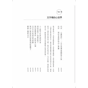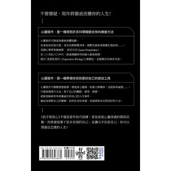 在西方「表達性寫作」的心理學基礎上,融會多年心理勵志寫作與讀者互動的成果,以及實際籌辦心靈寫作課程的實作經驗,她規劃出適合東方讀者日常使用的心靈寫作模式。