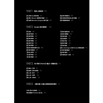 書中為各位簡單說明ZBrush的基礎,以及作品範例中所使用的功能、筆刷進行雕塑作業。雖然只使用基本的幾種筆刷工具就能夠製作,但如果能選擇適合用於自己想要製作的形狀的筆刷,作業起來的效率會更佳,並以封面的作品GAME為例,製作出整體的流程及提供完整的教學講解,再以3D印表機列印出零件、組裝、上色…等過程,對造形製作充滿興趣的你,一起讓想像力發揮創作的魅力!