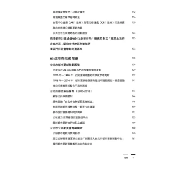 本書視野宏觀,採取創新策略,政府公權力介入整合以及誘導開發,一步步來解開城市陷入「一灘止水」的困境,這需要都市治理的高度視野,以及策略規劃的格局,再加上有力道的執行魄力不僅可用之於台北市的創新發展與再生,對應都市發展所面臨或將面臨的課題,並設定議程。將實質課題逐一鉅細靡遺且詳實地書寫,點點滴滴描繪解決與決策過程,足供處於同樣狀況的都市參考酌用。