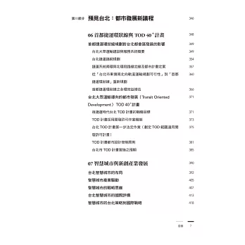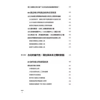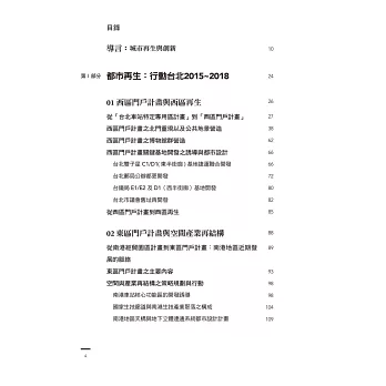 本書分為三大部分:「都市再生:行動台北2015~2018」、「預見台北:都市發展新議程」、「台北的當代性:現在與未來之間的對話」,係以「城市再生與創新」為主軸,且有鑑於台北市乃台灣城鄉中,之於都市發展與都市治理議題最具實踐性與爭辯性的代表城市,書中以「台北都市發展議程」為申論之主要場域。