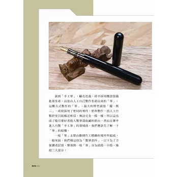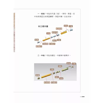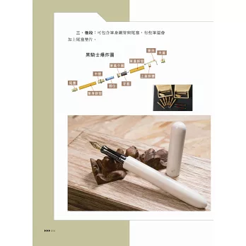 一枝「筆」主要由數個作工精緻的零件所組成,一般來說,我們稱這些為「製筆套件」。以下為了方便讀者記憶,樂爸將一枝「筆」分為前段、中段、後段三大部分: