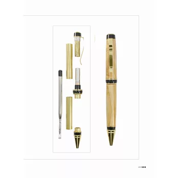⑥ 進行組裝:在組裝自製的「手工筆」時,我們可以預先準備好壓筆器來輔助組裝。組裝前可將所有「手工筆」套件與我們剛完成車製的筆身、筆蓋依序排列好,這樣比較不會發生組裝錯誤而手忙腳亂。萬一真的出現組裝錯誤的情形,還可使用退筆器重新再按部就班進行一次。