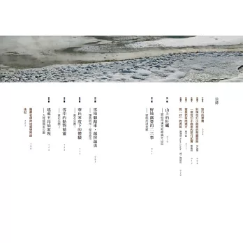 ◎本書關鍵字:旅行散文、處世哲學、自然探索、地質知識、雪地露營、野溪溫泉、黃石公園