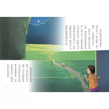 媽媽笑了笑說:「你們兩個只看火焰蟲不看路,我也怕你們會掉進田裡去,那就走大路!不過,大路遠很多,你們可不要走著、走著睡著了,我一個人背不動兩個小孩喔!」