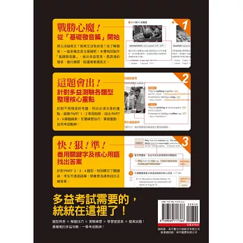 針對不同情境的考題,列出必須注意的重點。避開PART 1、2常見陷阱,找出PART 3、4解題線索。反覆練習技巧,掌握重點,自然考成戰神。
