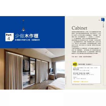 4.估價時若能多規劃「木作替代工程」,可以省很大:隔間牆或天花板不一定要指定矽酸鈣板,防潮石膏板和輕鋼架等建材或工法省錢又耐用。還有,少做不實用的木櫃可以省、不做門片可以省、選對層板可以省──但問題又來了,找師傅用木芯板釘木櫃和挑現成系統櫃,哪一種才是「真正省又不變形」?