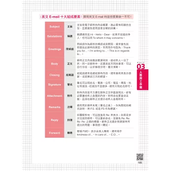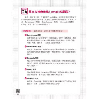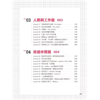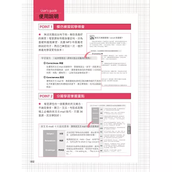 全書共分4篇、36堂課,每堂課包含一個重要的英文概念,有別於坊間內容雜亂無章的英文學習書,不論是發音、聽力、文法、句型或是職場上必備的英文E-mail技巧全都包,只要36堂課,英文學到好!