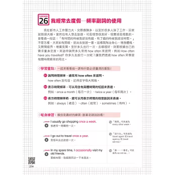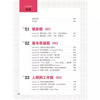 模仿是進步的開始!在還沒有辦法自己說出完整的句子前,透過複誦就能一次次地進步。每堂課皆有暖身會話句,分為基礎和進階練習,先聽MP3中美籍老師說的句子,再自己練習說一次,循序漸進地學習更有效率!