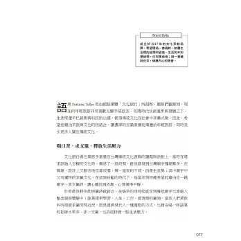 了解手搖飲國際脈動,並依照品牌發展3階段「啟動關注期」、「發展擴充期」、「成熟優化期」,提供「品牌力」、「商品力」、「營運力」、「設計力」、「店鋪力」、「活動力」、「服務力」的經營操作,同時一窺23家台灣、海外手搖飲品牌運營術,開店計畫書step by step……教你成功開店,開創自己的品牌之路。
