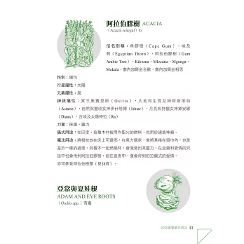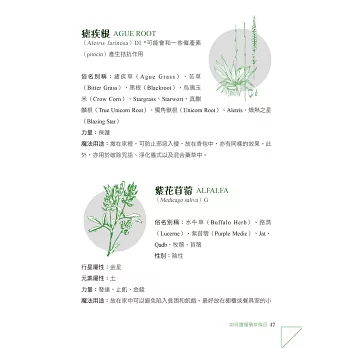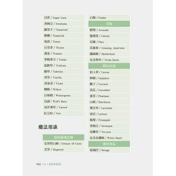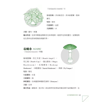 ★超過400種藥草的介紹,「俗稱別名」、「植物性別」、「行星屬性」、「元素屬性」、「神祇屬性」、「魔法力量」、「儀式用途」、「魔法應用」,資訊豐富完整,查詢便利。