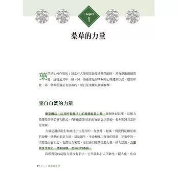 本書以百科全書的形式呈現,分為三個部分:「基本藥草學」、「藥草」和「表格和附錄」,可幫助你快速收集到一個適宜且合格的應用材料,或是知識學習相對應的參考。