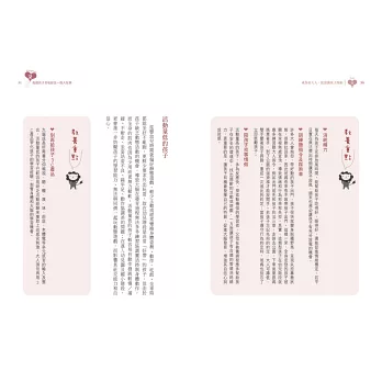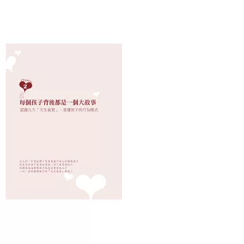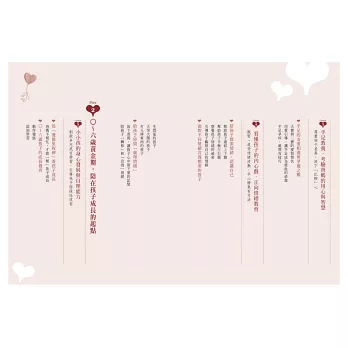 本書從孩子的天生氣質、各領域發展、手足相處、不同年齡常見疑難雜症等各種角度著手,幫助大人們學習觀察、用心賞識孩子與生俱來的特質;再者,透過介紹分齡的促進發展遊戲,來協助大人們成為孩子最喜愛的陪伴者,進一步創造屬於親子之間的美好回憶;最後,我分享自己和多位媽媽在育兒路上的心路歷程,從過來人角度寫下「給從前的自己一些話」,給在教養過程曾經懷疑、沮喪、生氣、自責的妳,一些溫暖能量,幫助妳找回那顆愛孩子的初心──我們不必是最完美的大人,但要一起努力成為愈來愈好的大人。