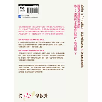 西方諺語有這麼一句話“It takes a village to raise a child”,意思是,養育一個孩子,沒這麼簡單,需要眾人的努力。徐瑜亭老師這本書,每一章都有很具體的教養方法,很深厚的發展學基礎,每一句話都有讓父母省思的道理,讓你不用花費眾人之力,就可以教出好孩子。更重要的是,我覺得這本書,可以幫助你了解自己,找出教養的盲點。我誠摯推薦這本結合育兒經驗、發展學、心理學、教育學的《從心學教養》,給世上所有深愛孩子的好爸媽。