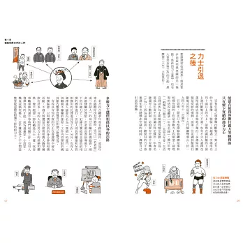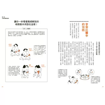 從國技館的一天、相撲部屋的一天到相撲力士的一生,書中將以插圖說明關於相撲的大小事,包括如何成為力士、力士的位階待遇、土俵上競技規則與後臺流程,給你滿滿的賽前幕後情報。