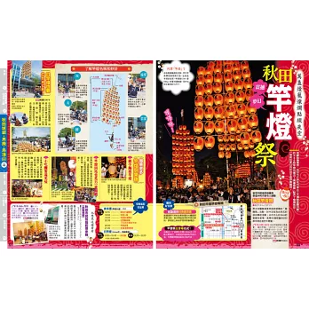 而秋田著名的祭典,則有秋田竿燈祭,大曲煙火和男鹿生剝鬼。秋田竿燈祭在夏天盂蘭盆節前夕登場,為了祈求五穀豐收,無病無災,民眾舉起高高的竿燈,上頭結滿燈籠,行走搖曳間展現力與美的華麗演出;大曲煙火則有來自日本全國各地的煙火師,以精湛的技術和發想,在大曲夜空綻放萬千璀璨煙火;男鹿生剝鬼節則可說是小朋友最害怕的傳統民俗活動,生剝鬼模樣雖然嚇人,卻是能消災去病,帶來祝福的神靈。